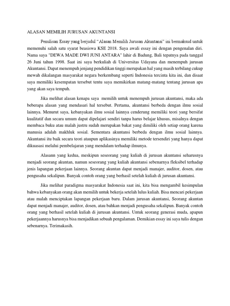 ESSAY KSE - Copy - Alasan memilih jurusan akuntansi Dewasa ini pendidikan merupakan salah satu hal yang penting untuk bisa bersaing menjalani sulitnya | Course Hero