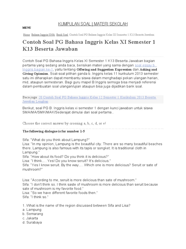 Contoh Soal PG Bahasa Inggris Kelas XI Semester 1 K13 Beserta Jawaban - Kumpulan Soal | Materi Sekolah