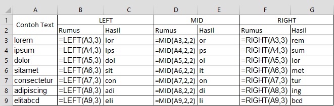 Fungsi LEFT, MID, RIGHT Untuk Mengambil Beberapa Karakter Teks
