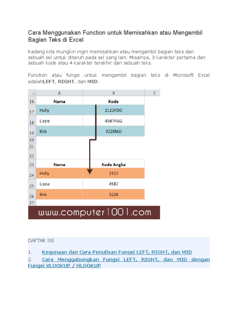 Cara Menggunakan Function untuk Memisahkan atau Mengambil Bagian Teks di Excel – Computer 1001