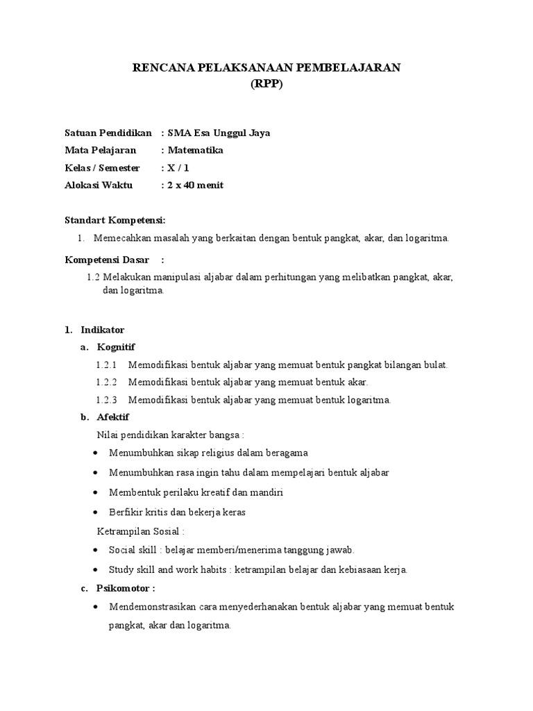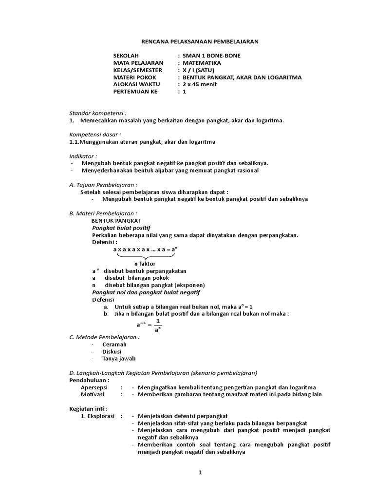 1. RPP Matematika SMA Kelas X Bentuk Pangkat Dan Akar