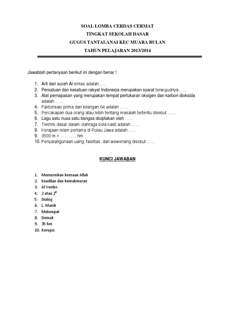 Soal Lomba Cerdas Cermat Sd Dan Jawabannya - Ada Lomba