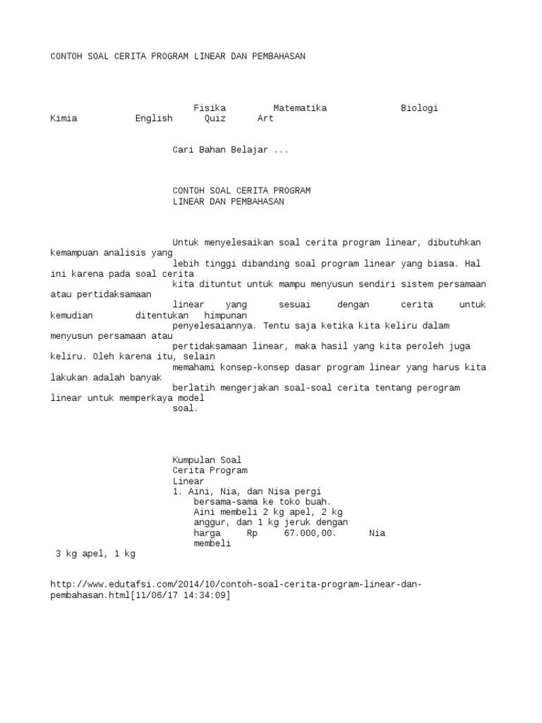 Contoh Soal Cerita Program Linear Dalam Kehidupan Sehari Hari …