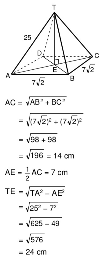 Pada limas beraturan T.ABCD, panjang rusuk tegaknya 25 cm dan …