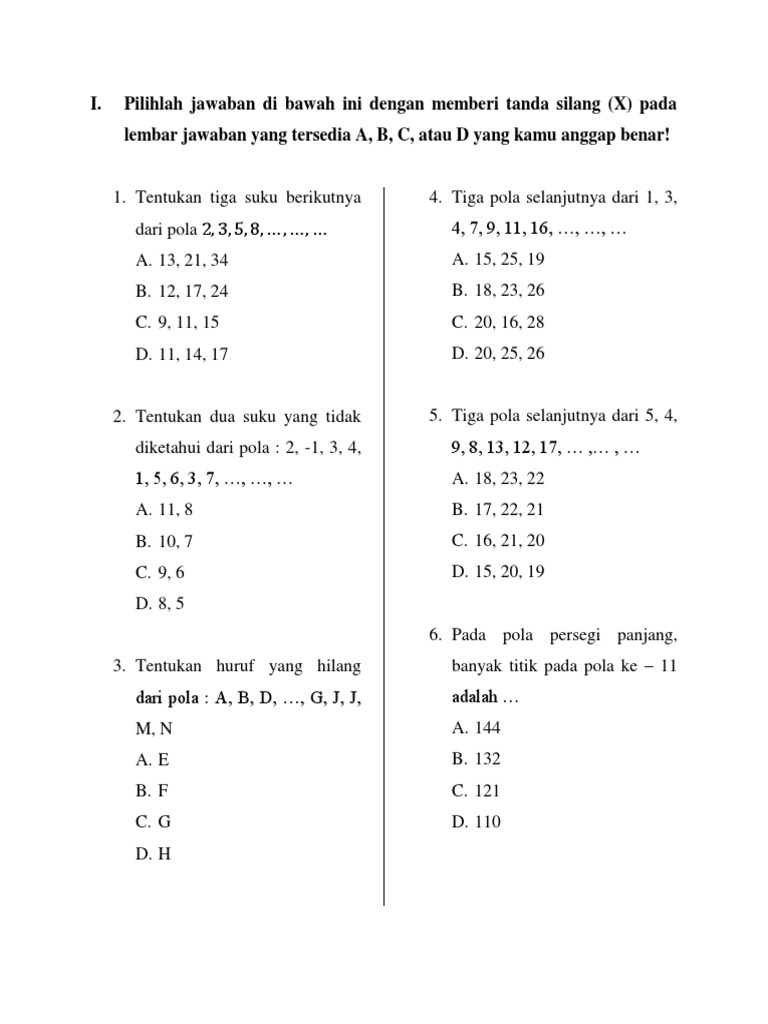1.Dua suku berikutnya dari pola: 4,8,14,22, adalah2.Tiga suku …