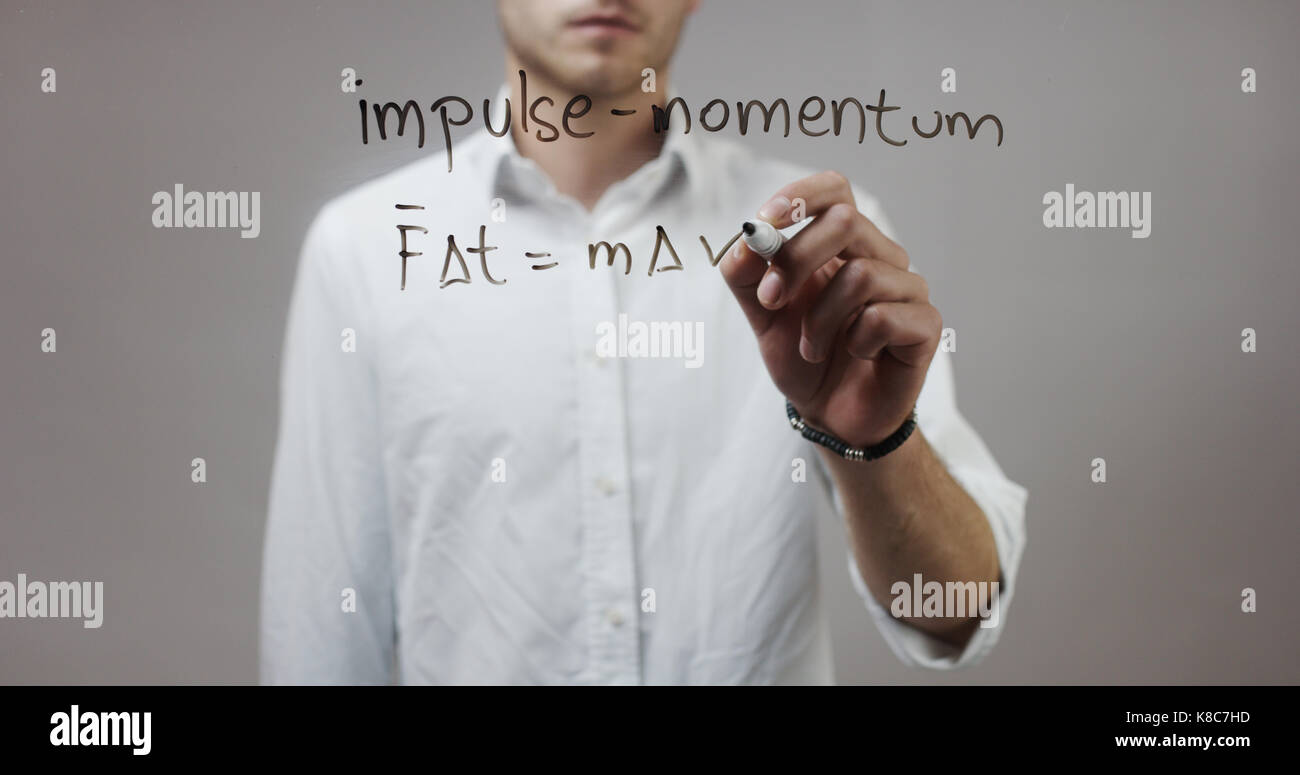 Impuls-momentum formula , Man Writing on Glass Stock Photo - Alamy