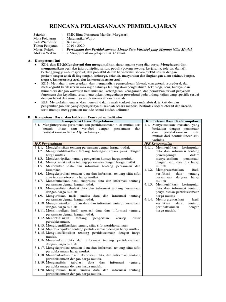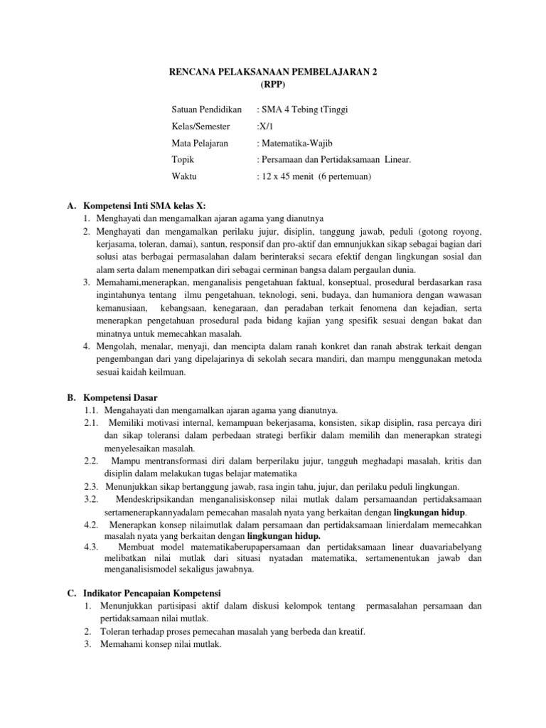 DOC) RPP PERSAMAAN & PERTIDAKSAMAAN NILAI MUTLAK K13 REVISI | Louis Goloh - Academia.edu