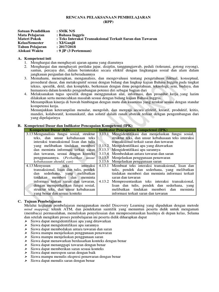 Rpp bahasa inggris wajib kurikulum 2013 kelas xi semester 1