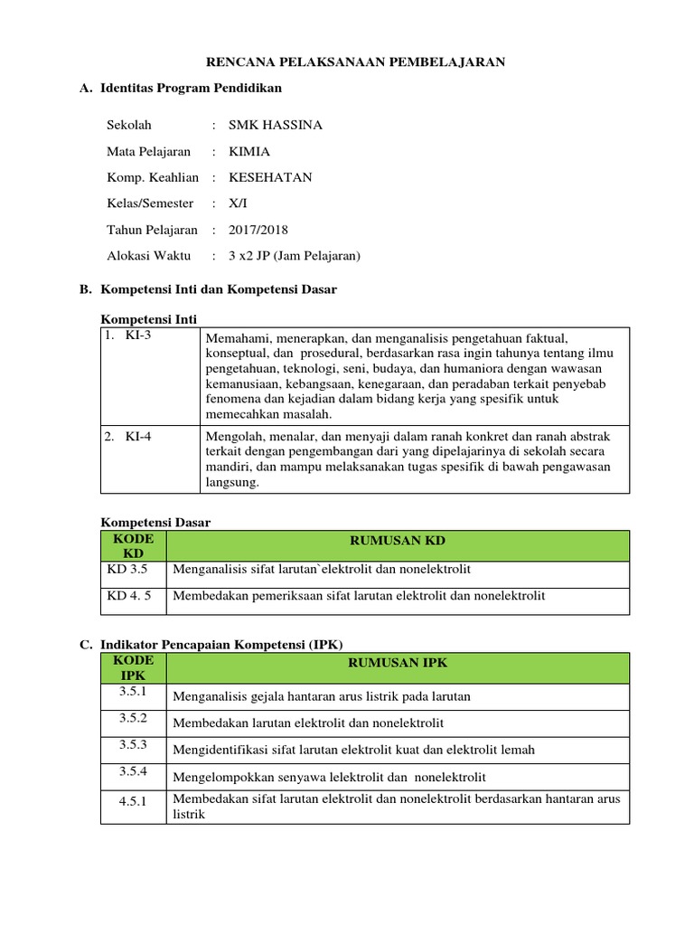 RPP KIMIA LARUTAN ELEKTROLIT.docx - RENCANA PELAKSANAAN PEMBELAJARAN(RPP Satuan Pendidikan SMK PELITA MADANI PRINGSEWU Kompetensi Keahlian FARMASI Mata | Course Hero