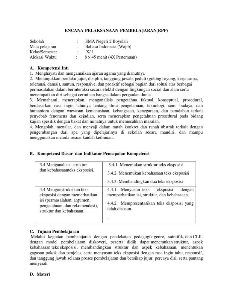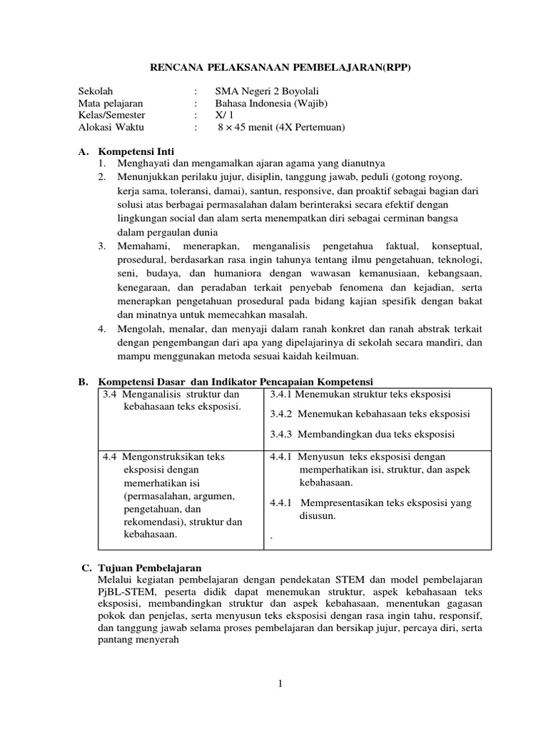 1. X RPP Teks Eksposisi-STEM.docx - RENCANA PELAKSANAAN PEMBELAJARAN(RPP Sekolah Mata pelajaran Kelas/Semester Alokasi Waktu SMA Negeri 2 Boyolali | Course Hero