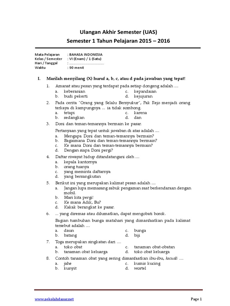 www.sekolahdasar.net Soal UTS Bahasa Indonesia Kelas 6 Semester 2 | 1SOAL ULANGAN TENGAH SEMESTER 2SEKOLAH DASARTAHUN P… | Bahasa indonesia, Bahasa, Pendidikan