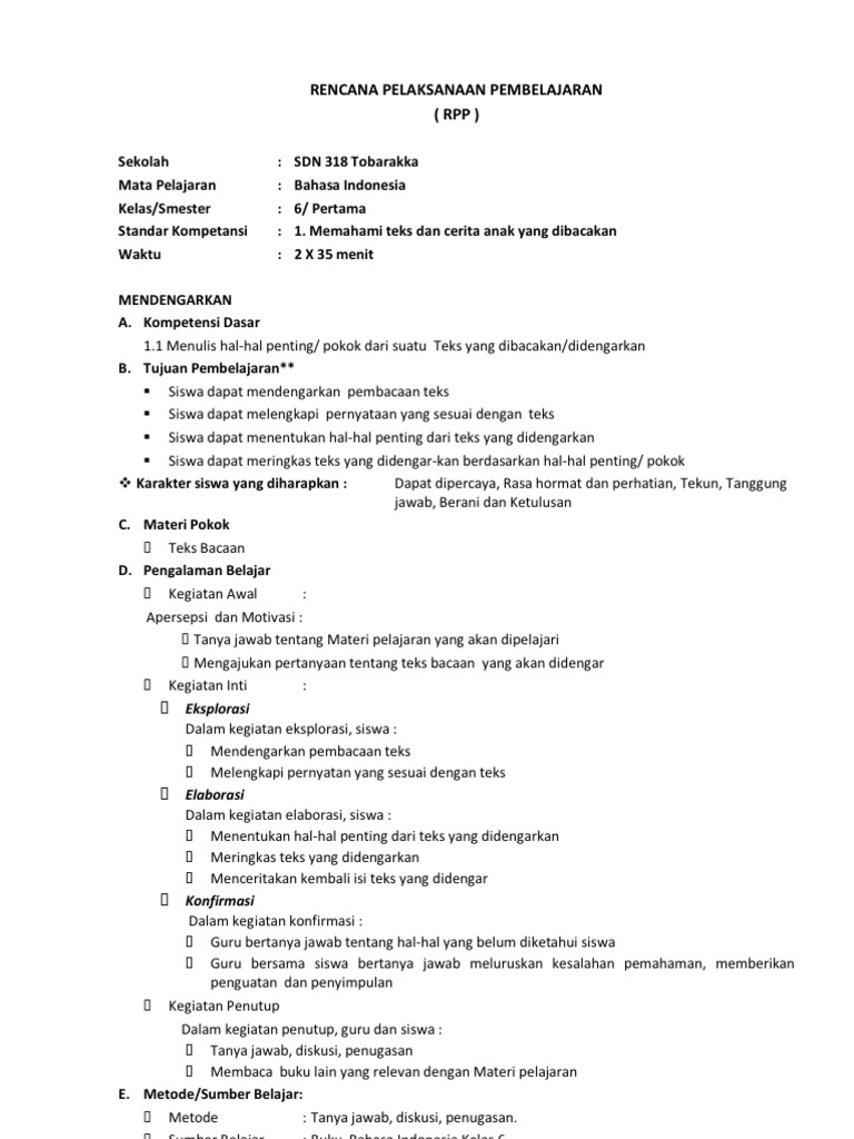 Rpp Bahasa Indonesia Kelas 6 Semester 1 Dan 2