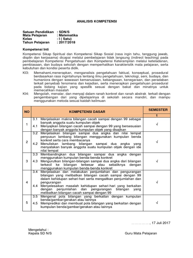 Analisis Kompetensi Matematika kelas 1 SD