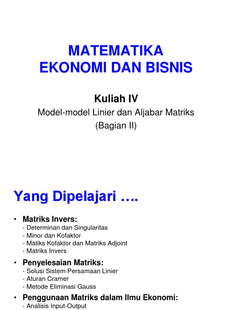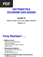 Kuliah IV Penerapan Matriks - MATEMATIKA EKONOMI DAN BISNIS Kuliah IV Model-model Linier dan Aljabar Matriks(Bagian II Yang Dipelajari Matriks Invers | Course Hero