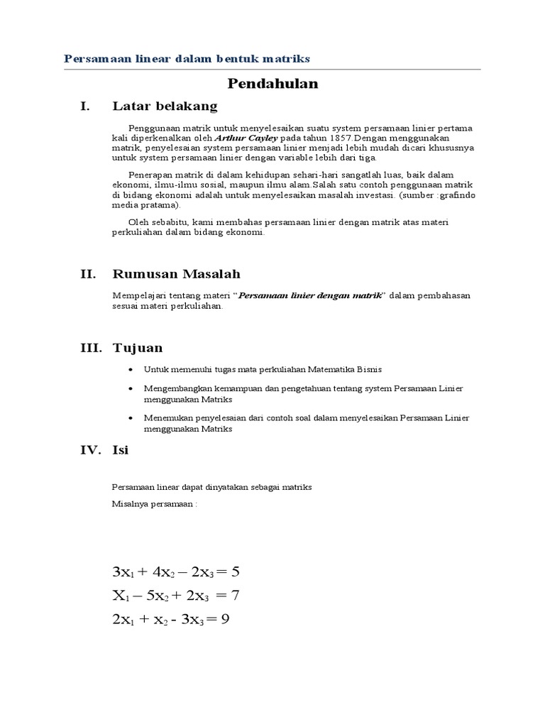 Isi Makalah Mat. Eko Kel 3.docx - BAB I PENDAHULUAN 1.1 Latar Belakang Matriks dan vektor merupakan hasil penemuan penting dalam matematika Keduanya | Course Hero