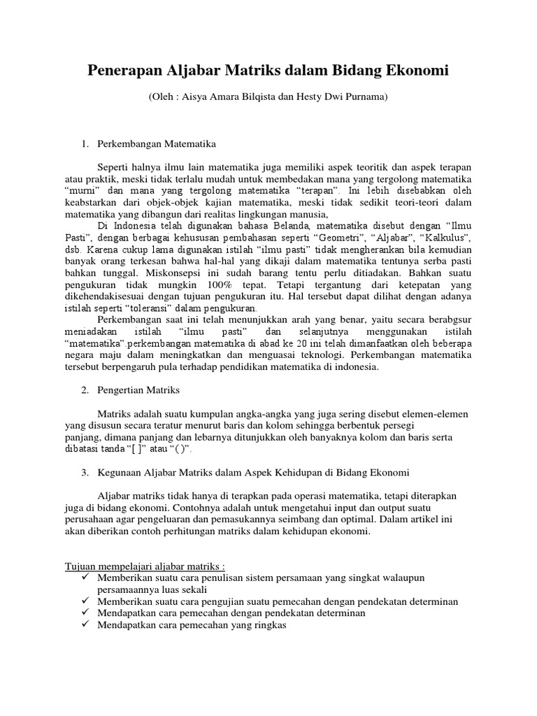 APLIKASI MATRIKS DALAM BIDANG EKONOMI SEBAGAI .aplikasi matriks dalam bidang ekonomi sebagai analisis - [PDF Document]