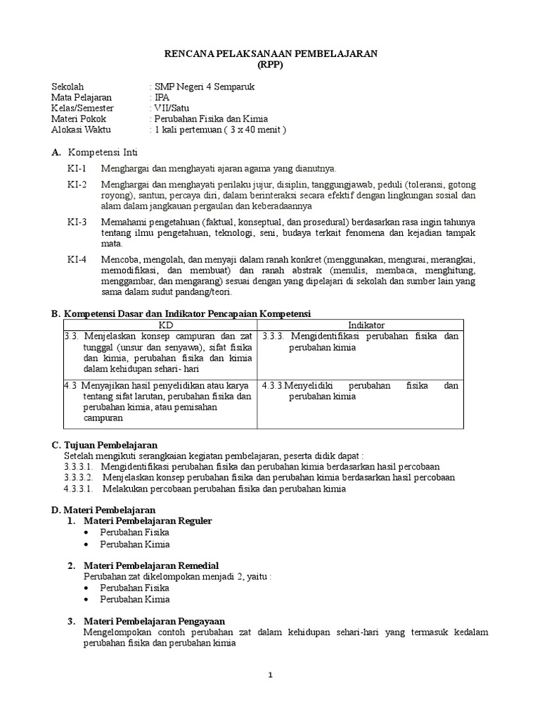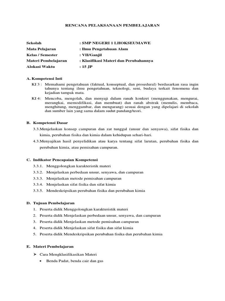 1 RPP KD 3.3 Klasifikasi Materi.docx - RENCANA PELAKSANAAN PEMBELAJARAN(RPP Satuan Pendidikan Mata Pelajaran Kelas/Semester Materi Pokok Alokasi Waktu | Course Hero