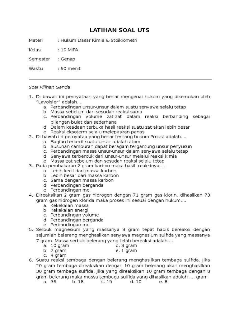 Contoh Soal Kimia Uts Kelas 10 - Dunia Sosial